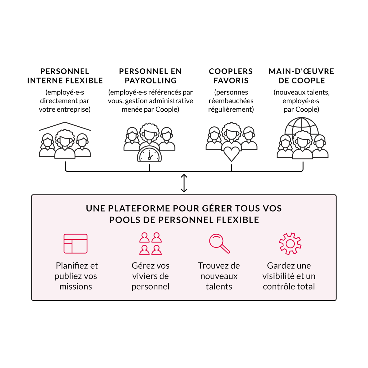 La Plateforme Coople Flex vous aide à organiser efficacement votre personnel flexible, en réunissant vos équipes internes, travailleur·euse·s en payrolling et nouveaux talents dans des groupes fiables et efficaces.