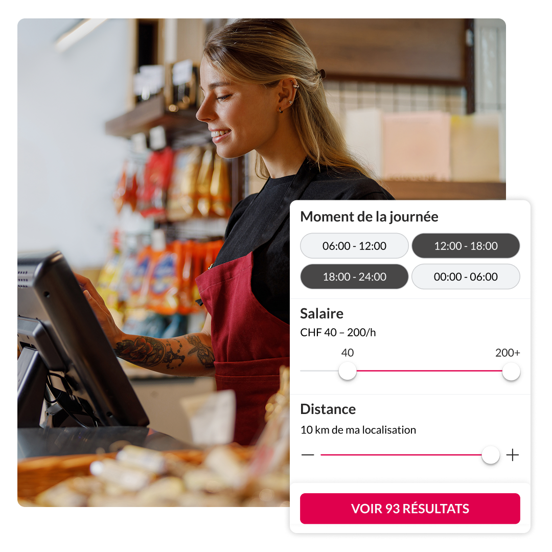 Sur Coople, vous pouvez trouver de nombreuses missions en tant que conseiller/ère de vente, coursier/ère ou en tant que caissier/-ère. Quelles que soient vos compétences, nous avons besoin de vous! Créez votre compte rapidement dans l’application Coople Jobs et faites vos recherches d’emploi en fonction du titre de travail souhaité, du nom de l’entreprise ou simplement, en appliquant des filtres géographiques ou des préférences salariales.