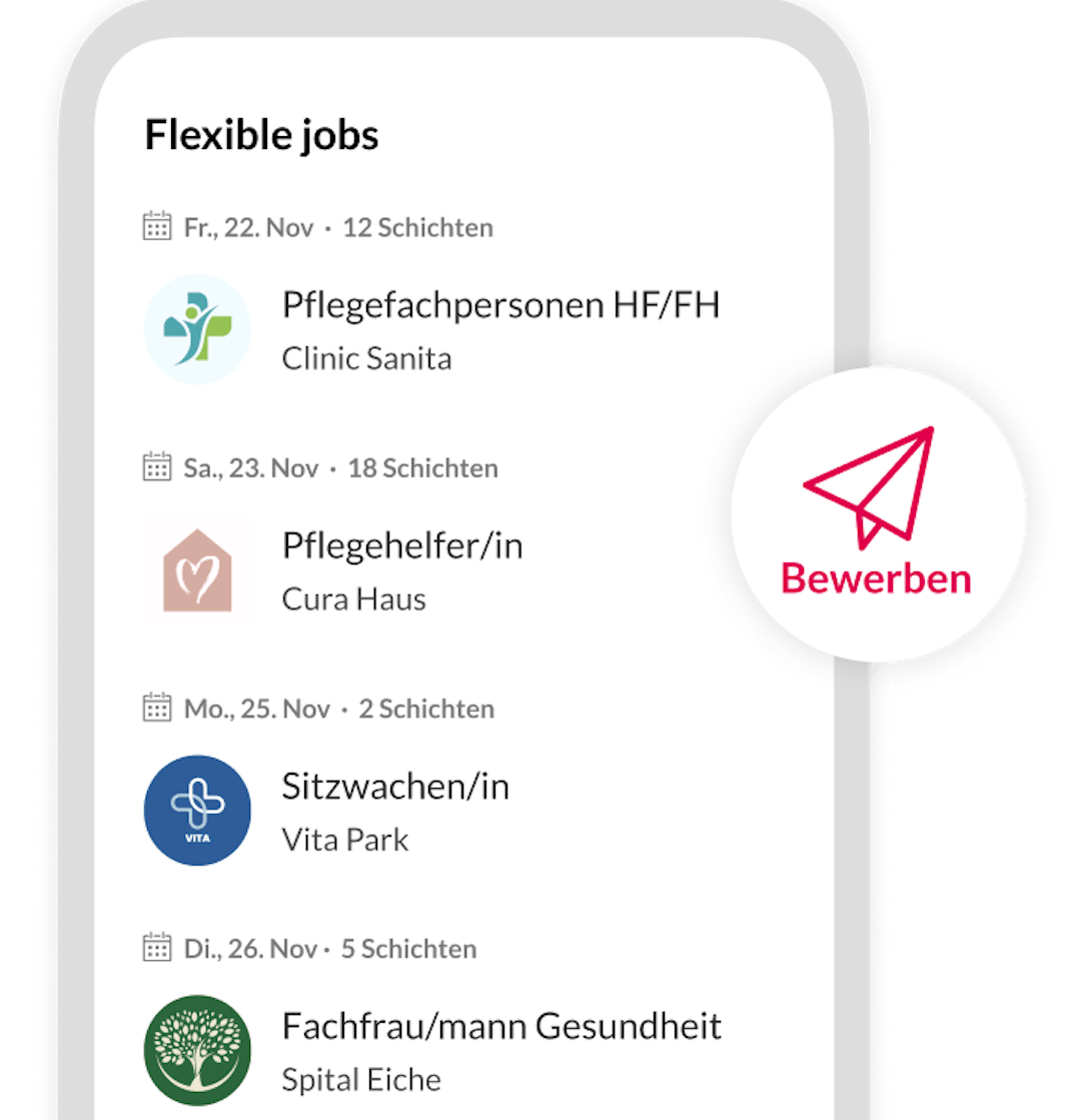 In der Coople Jobs App findest du diverse Einsätze im medizinischen Pflegebereich und in der Betreuung. So hast du die Möglichkeit, in deiner Nähe in einem Spital, in einer Rehaklinik, einem APH oder bei der Spitex zu arbeiten.