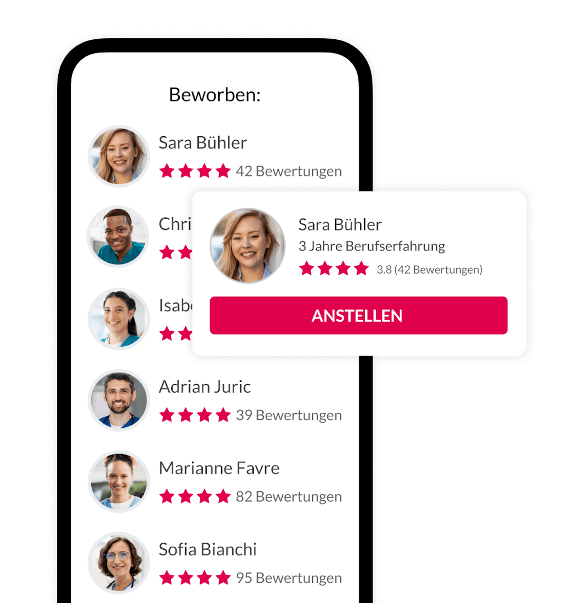 Wir wissen, wie wichtig es ist, Personalengpässe rasch zu schliessen und damit Ihr Kernteam zu entlasten. Mit Coople finden Sie jederzeit qualifiziertes Gesundheitspersonal – genau dann, wenn Sie es brauchen. Wann und wie lange die Mitarbeitende im Einsatz sind, bestimmen Sie.